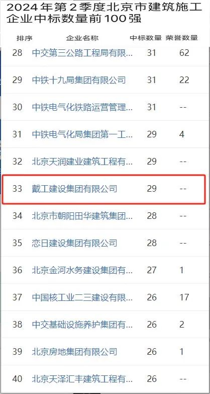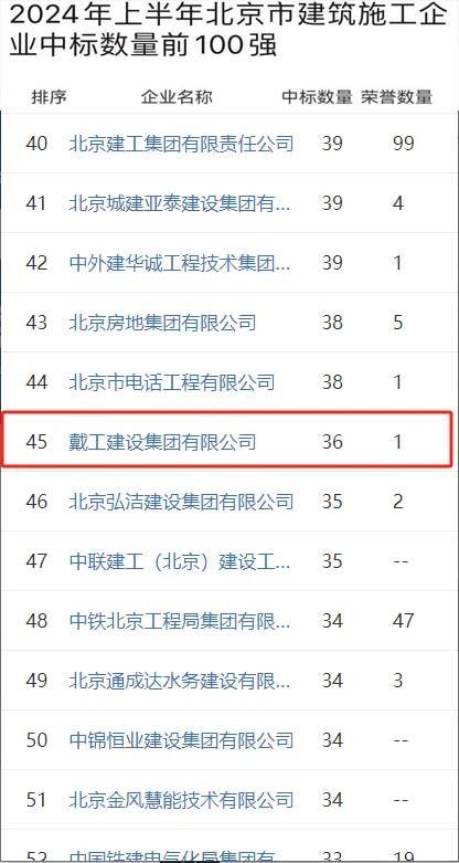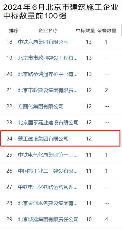 時間推進到2024年6月,戴工集團更是迎來了單月的高光時刻。在這個關鍵月份,戴工集團憑借出色的項目策劃和執行能力,一舉將排名提升至北京市建筑施工企業中標數量前100強的第24位。這一成績的取得,充分展示了戴工集團在短期內的快速響應能力和高效執行力,也為其在市場上的進一步拓展奠定了堅實基礎。