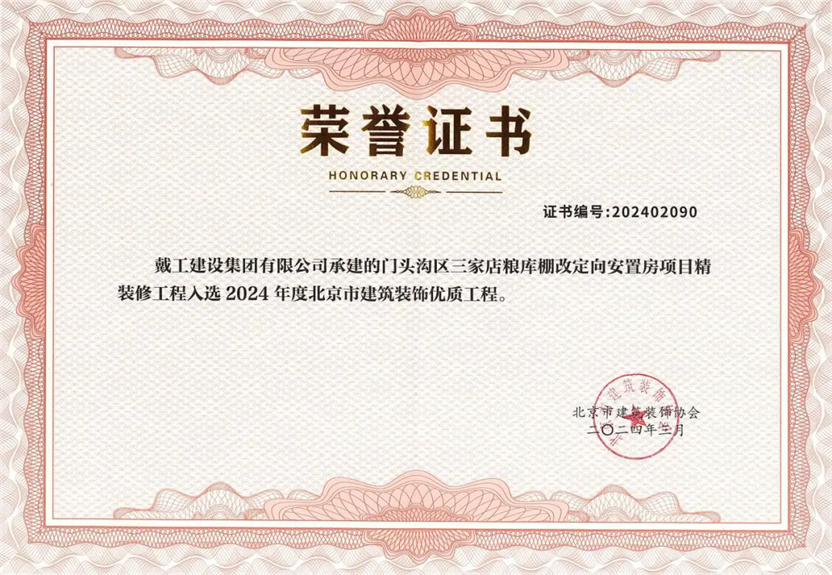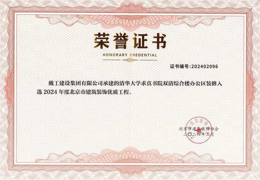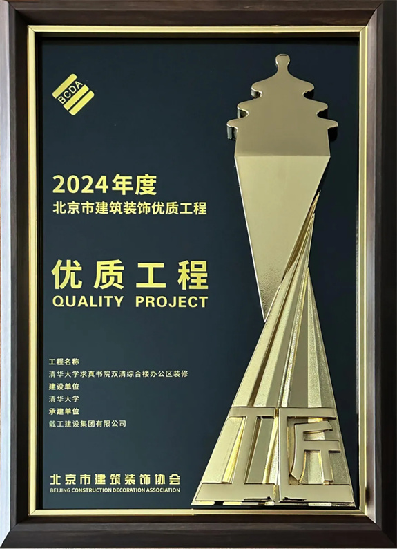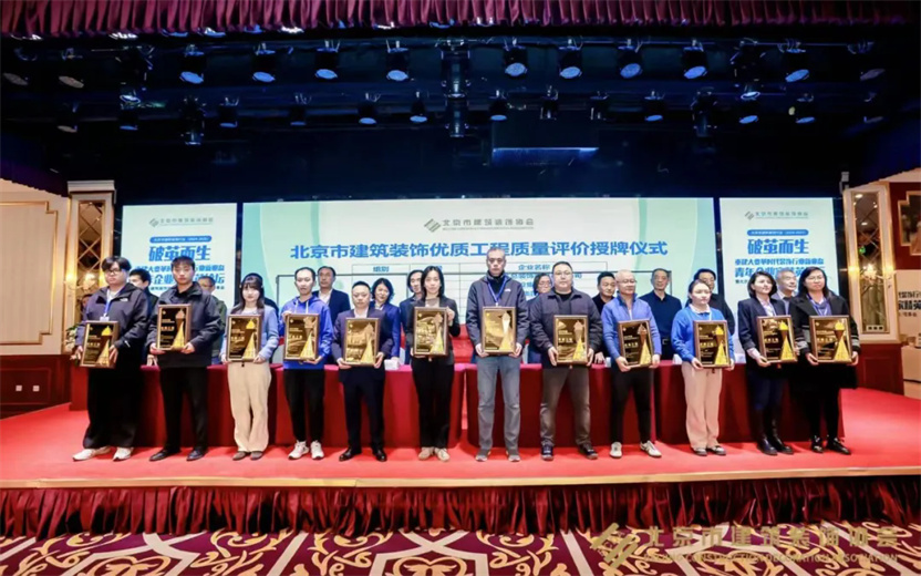 同時,2023-2024年度北京市建筑裝飾優(yōu)質(zhì)工程質(zhì)量評價結(jié)果及施工組織設(shè)計競賽也在會議中公布,戴工集團(tuán)憑借精湛的施工工藝和嚴(yán)格的品質(zhì)把控,所承建的“門頭溝三家店糧庫棚改定向安置房項目精裝工程”以及“清華大學(xué)求真書院雙清綜合樓辦公區(qū)裝修項目”均獲得2024年度北京市建筑裝飾優(yōu)秀工程獎!