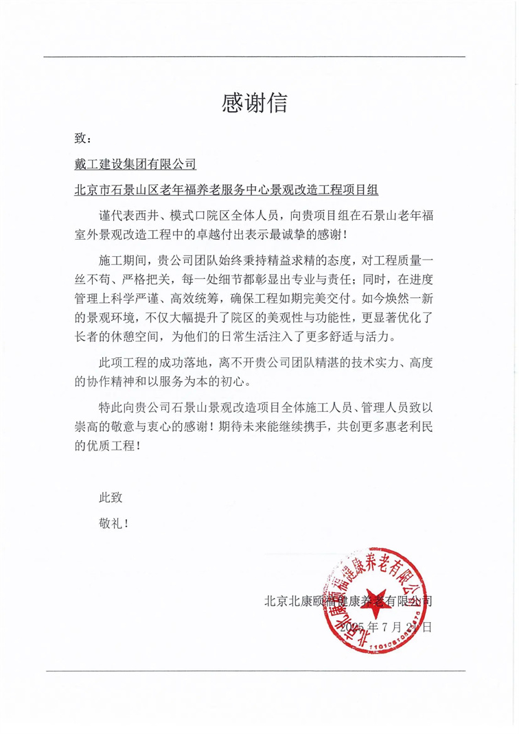 工程竣工后,石景山區老年福養老服務中心整體環境煥然一新。新建景觀區域在提升視覺美感的同時,顯著拓展了長者的休閑活動空間。養老中心負責人表示:"戴工建設集團的卓越工作使養老環境實現質的飛躍。其對工程質量的嚴苛要求與按期交付的專業素養令人欽佩。為此,養老中心特向戴工建設集團致送感謝信以表誠摯謝忱。